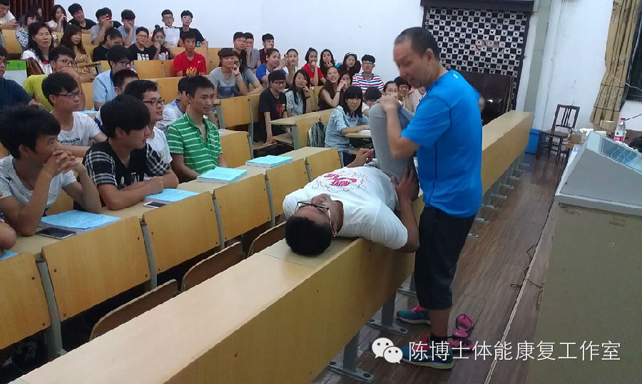 In the afternoon on the same day, Dr. Chen held exchange activities respectively on the topic of physical rehabilitation with teachers and students. Dr. Chen interacted with teachers and students on how to study and lecture for this course, and emphasized how important this was. Dr. Chen had an in-depth discussion with students who were in sports rehabilitation and with sports training majors. Actual cases are always most practical and welcome. Faced with shy students, Dr. Chen invited a few students with different types of injuries to step forward, and conducted check-ups and treatments for them on the spot, which allowed the students to experience the magical effects that sports rehabilitation had brought them. The real purpose of such experience was to promote more interest in sports rehabilitation among students.