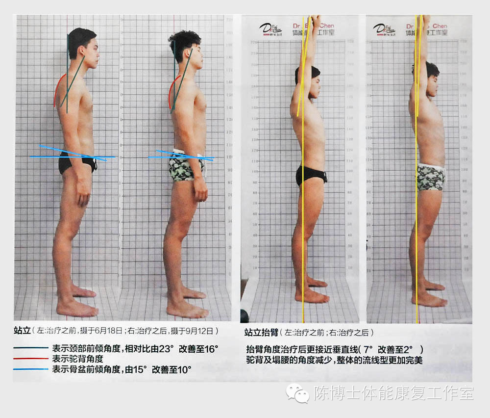 同时,我们对小余的生活习惯进行了干预,要他无论在坐立,还是在行走中,都要有意识地改变过去含胸驼背爱低头的毛病。我们还建议队医,不时提醒小余,尽可能保持“坐如钟,站如松”的良好体态。每堂训练后,队医会对其进行有针对性的按摩放松。我们也适时下队跟踪小余的训练感觉,结合教练、队医的反馈信息,及时调整治疗方案。