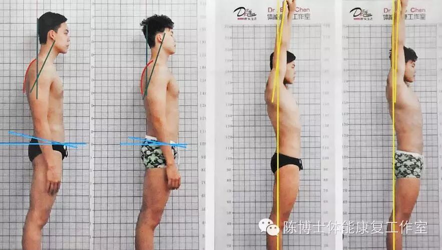 我发现,小余的肩部在向上伸展时,与脊椎的位置并不能形成一个良好酌流线型。用运动医学的临床术语来说,上身形成了一个大上交叉状态,即,从颈部后面到胸前部形成一条发紧、软组织缩短的连线,与此相反,颈前部到上背部却形成一个软组织松弛的连线,两个连线呈交叉状。这使得他的颈椎与胸椎的位置变形,在他抬手用力时,身体会往前塌,肋骨和肚脐前顶,如果身子放直,那双臂会无法垂直。